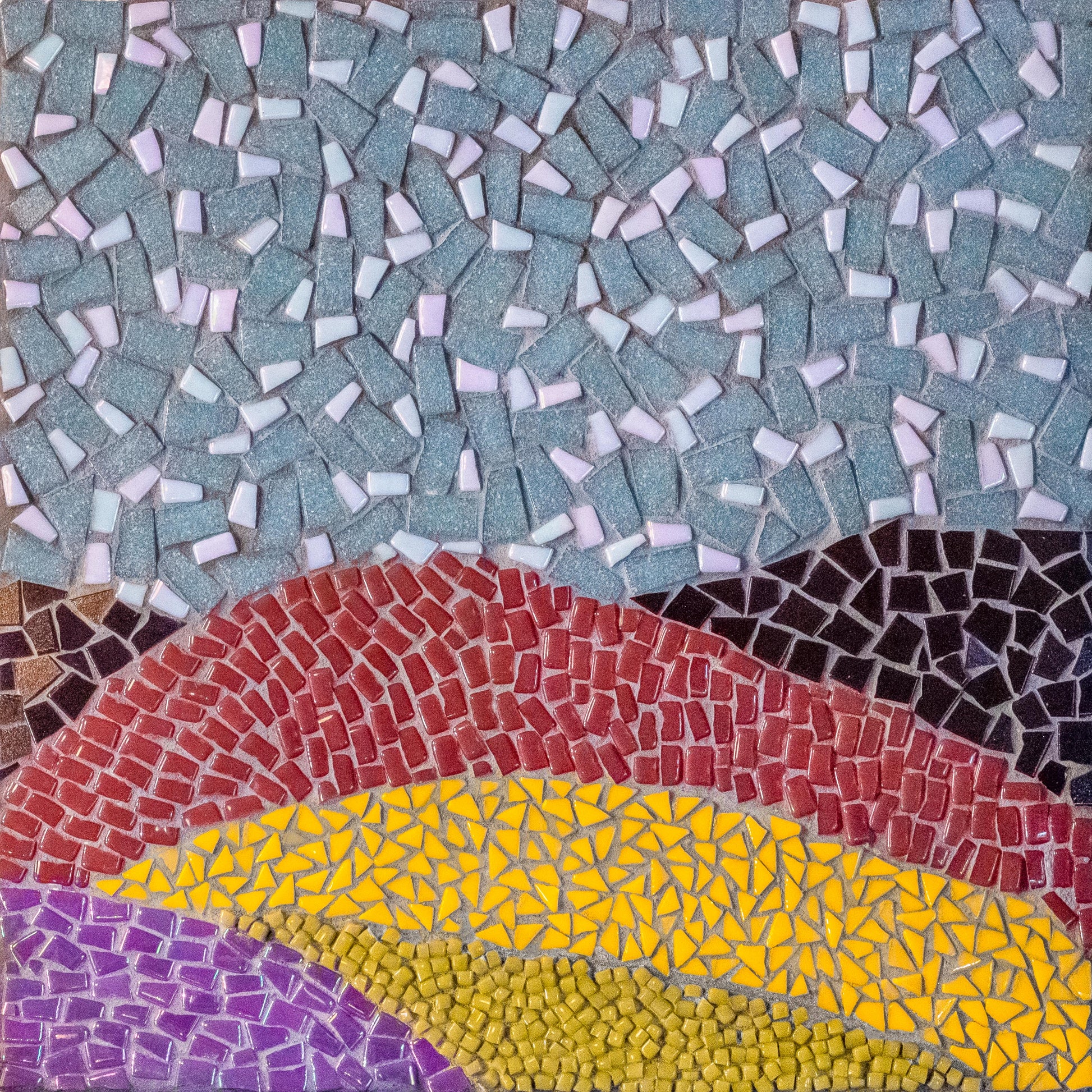 12 x 12 inch imaginative mosaic landscape. Suited for indoor and outdoor. No hanging mechanism.