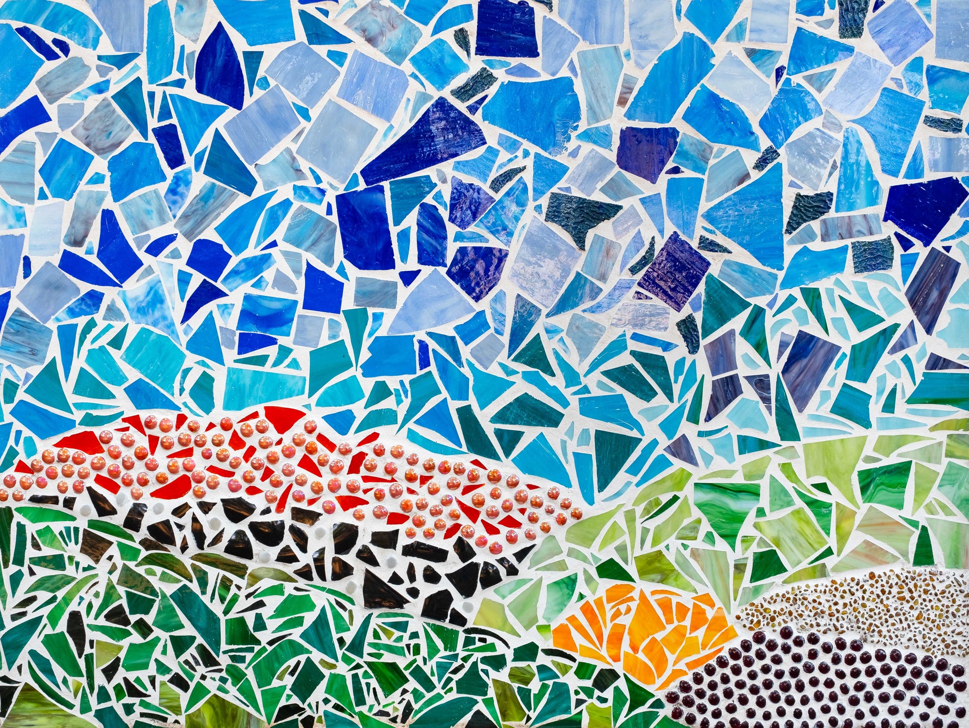 36 x 48 inch mosaic landscape of the colorful rolling hills of California. Suited for indoor and outdoor. Note - canvas is very heavy.