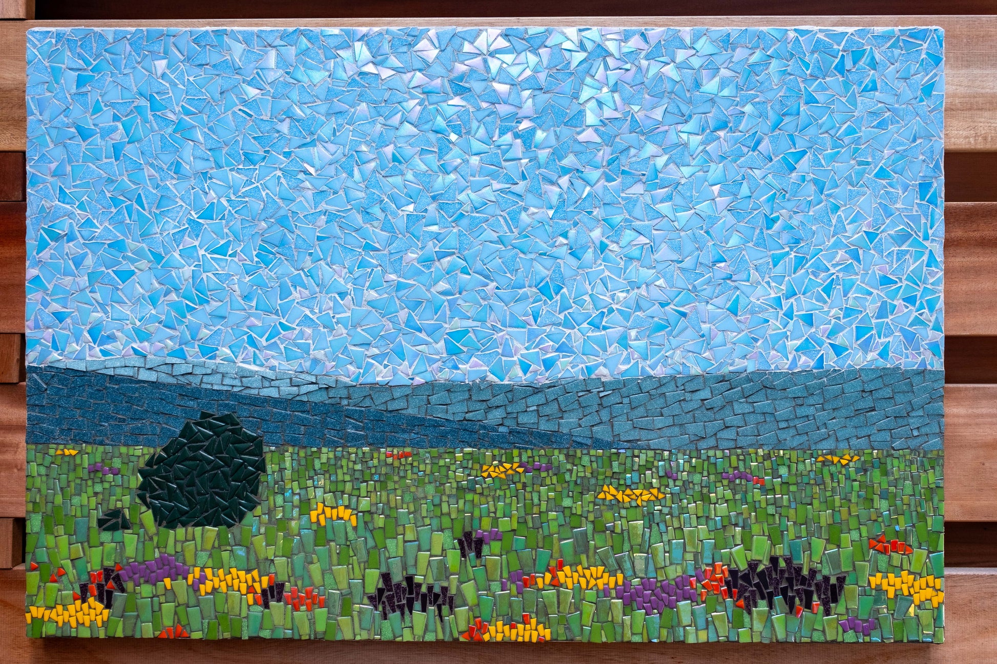 24 x 36 inch mosaic landscape looking to the hills from Russian Ridge Open Space Preserve, CA. Suited for indoor only.